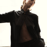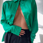 Drape yourself in timeless silky comfort with our versatile button down blouse, that features extra long sleeves, a curved hem and a loose cozy fit.