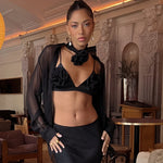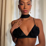 This silk triangle shape barlette will be your go-to. She's made to be shown off with any sheer tops, jackets or as is. Delicate silk chiffon rosette detail are hand sewn on the bust.