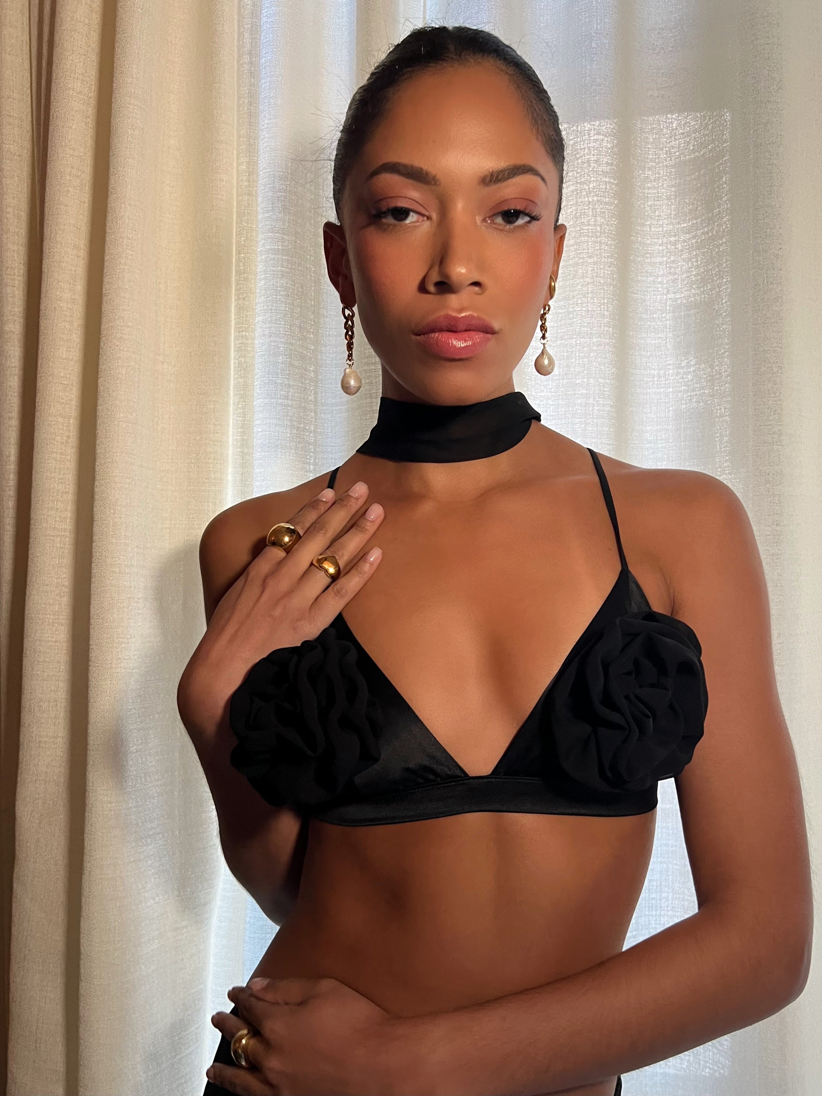 This silk triangle shape barlette will be your go-to. She's made to be shown off with any sheer tops, jackets or as is. Delicate silk chiffon rosette detail are hand sewn on the bust.